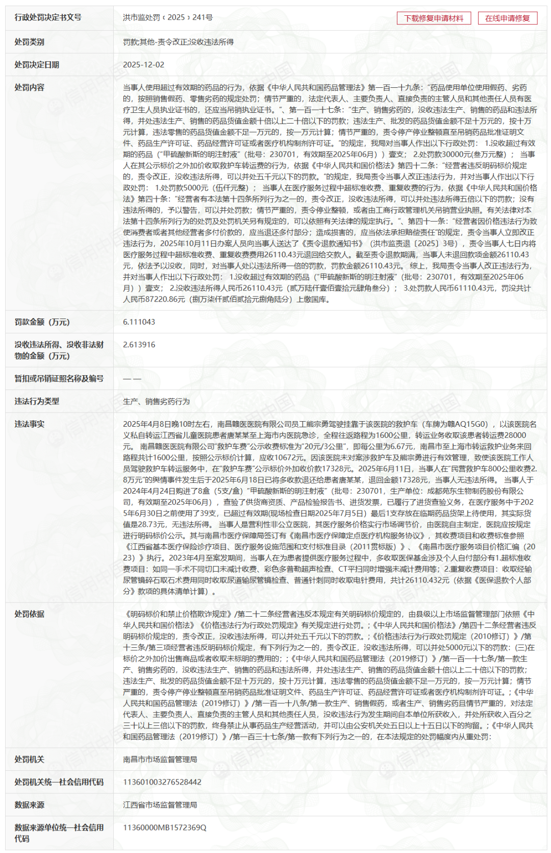 处罚内容称,该医院使用超过有效期的药品,被南昌市场监管局没收超过有效期的药品(甲硫酸新斯的明注射液),处罚款3万元。该医院在其公示标价之外加价收取救护车转运费的行为,被南昌市场监管局责令改正违法行为,并处罚款5000元。该医院在医疗服务过程中超标准收费、重复收费的违法行为,被监管部门责令改正违法行为,2025年10月11日办案人员向该医院送达了《责令退款通知书》,责令该医院在七日内将医疗服务过程中超标准收费、重复收费费用26110.43元退回给交款人。截至责令退款期满,该医院未退回款项金额26110.43元,依法予以没收,同时,对该医院处以违法所得一倍的罚款,罚款金额26110.43元。